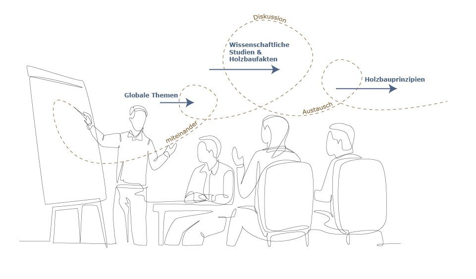 In 3 Modulen vermittelten die Coaches – allesamt erfahrene Holzwohnbau-Experten – notwendiges Wissen angepasst an die jeweilige Zielgruppe: Geschäftsführung, Planungsteam bzw. Projektleitung, Verkaufsteam, Facility Management – unterschiedliche Abteilungen benötigen unterschiedliches Know-How rund um Holz- oder Holzhybridbauweisen.