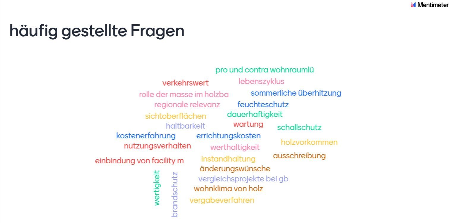 Häufig gestellte Fragen drehten sich bspw. um die Themen Vergabeverfahren, Ausschreibung, Errichtungskosten, Dauerhaftigkeit, Verkehrswert, regionale Relevanz, Holzvorkommen, Instandhaltung, Sichtoberflächen, Feuchteschutz, Brandschutz, Schallschutz, sommerlicher Wärmeschutz u.e.m.