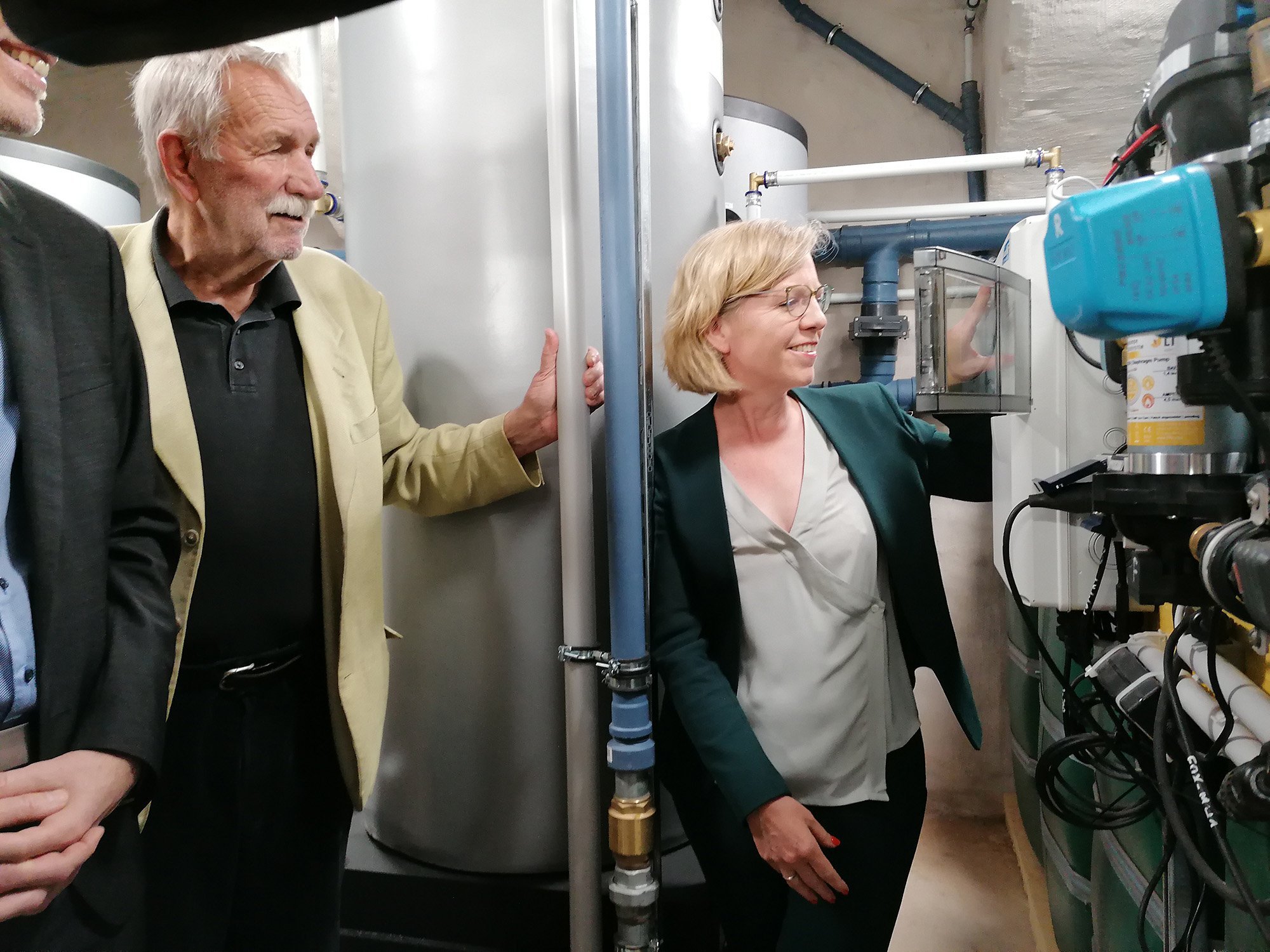 Das warme Abwasser aus Bad, Dusche und Waschmaschine (Grauwasser) wird biologisch durch Belebung gereinigt, sodass es der EU-Norm für Nutzwasser entspricht. Die Wärme des gereinigten Grauwassers (Grünwasser) wird danach über Wärmetauscher auf das kalte Frischwasser übertragen. Das sohin vorgewärmte Frischwasser wird durch eine Wasser/Wasser-Wärmepumpe auf 60°C erwärmt. Durch den hohen System-Wirkungsgrad (COP von 6) spart das System im Vergleich zu herkömmlichen Methoden ca. 50% Strom ein. Das abgekühlte Grünwasser eignet sich zur Raumkühlung, für die WC-Spülung und zur Bewässerung.